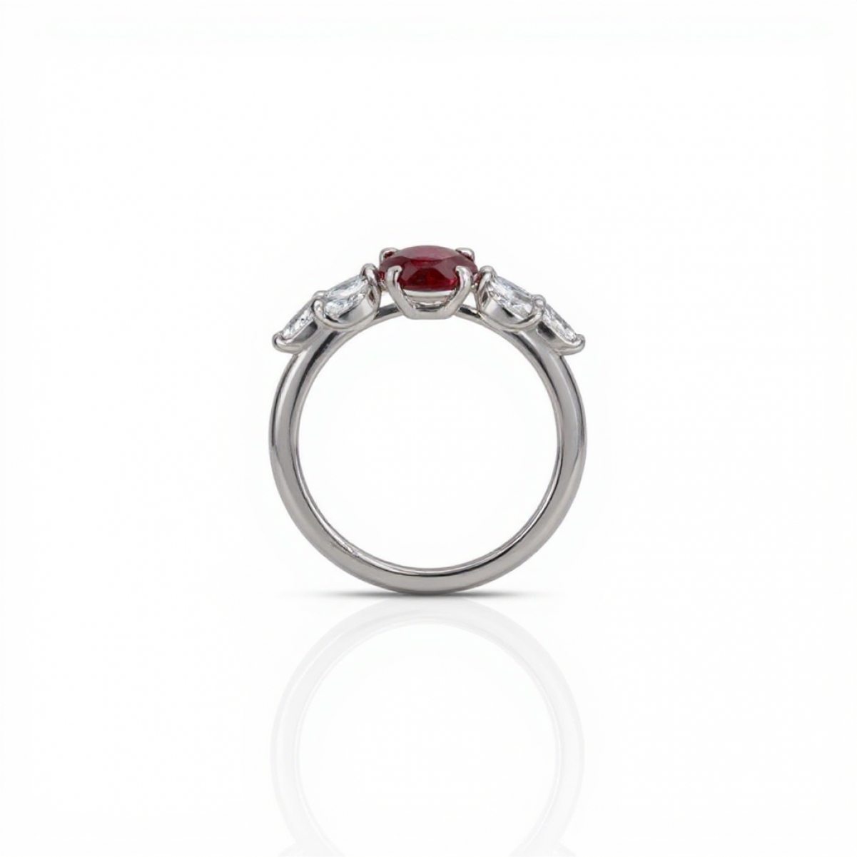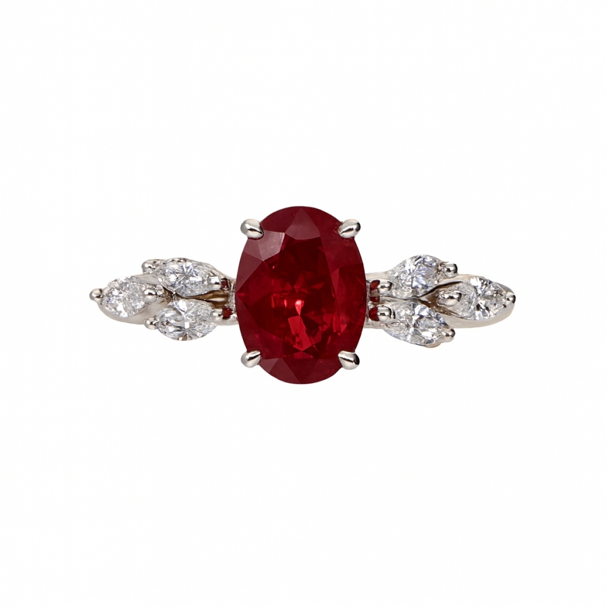 Questo anello in oro bianco monta uno splendido esemplare di Rubino di un magnifico rosso che richiama il sangue e la passione, il colore delle rose che si offrono per amore. Contornato da sei Diamanti taglio marquise che lo rendono ancor più aggraziato ed elegante, trasformerà chi lo indossa in una vera principessa...