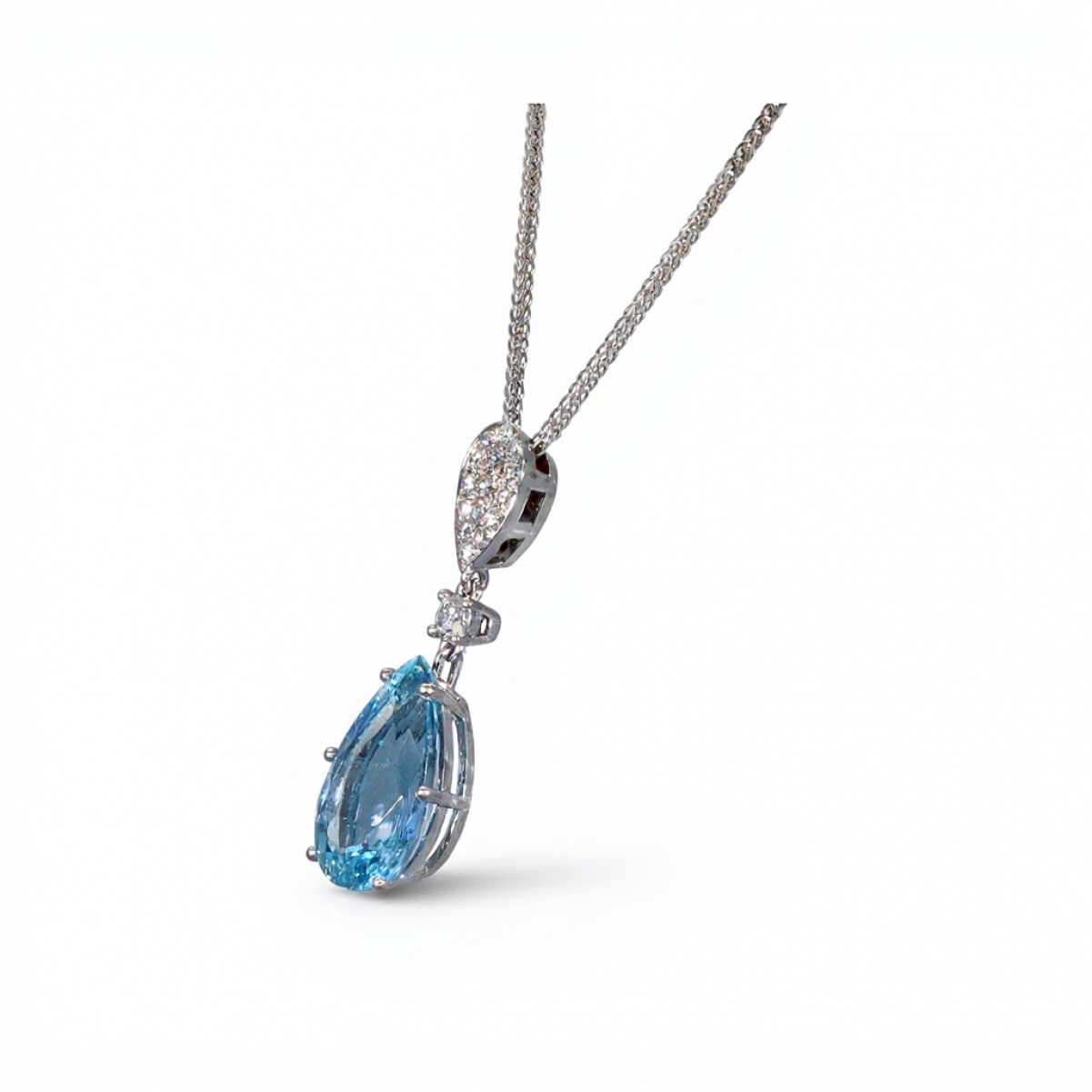 Pendente in oro bianco, Diamanti e goccia di Acquamarina di eccezionale qualità e colore, proveniente dalla miniera brasiliana di Santa Maria de Itabira. La rarità di questo tipo di pietra rende questo gioiello di particolare pregio.